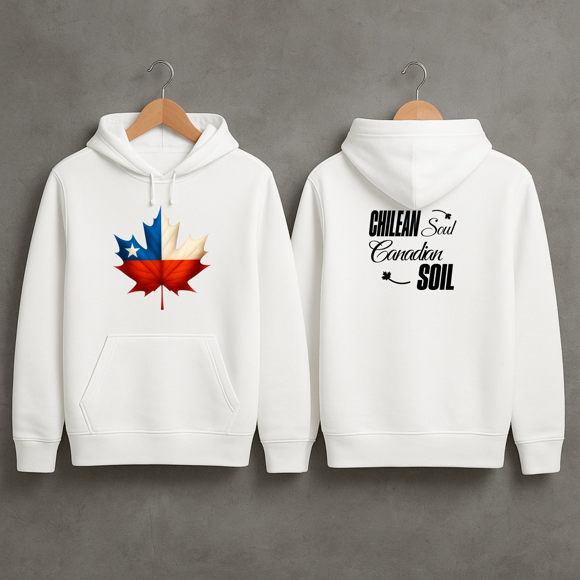 This design is a tribute to resilience, passion, and belonging—where the colours of Chile’s flag embrace the strength of the maple leaf.