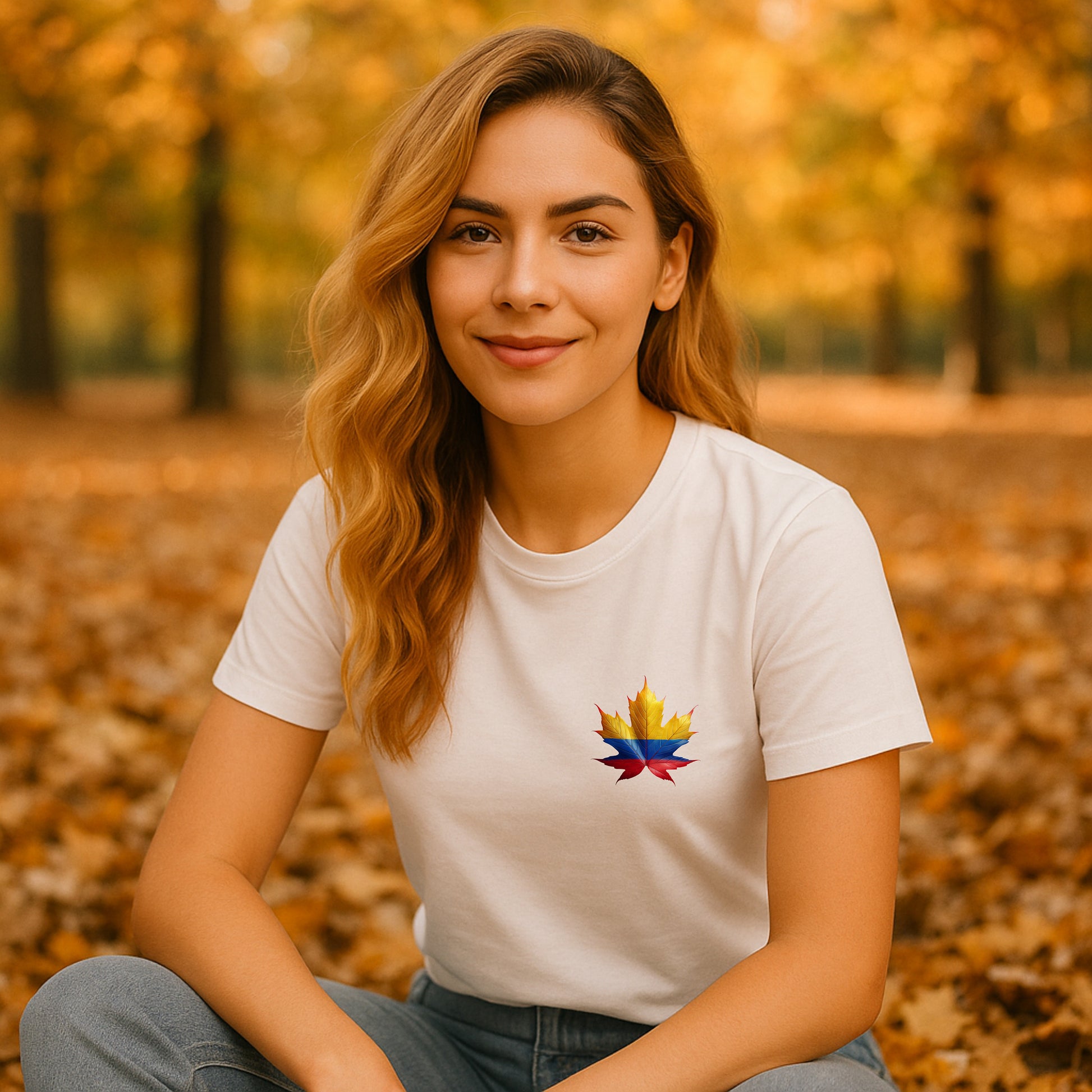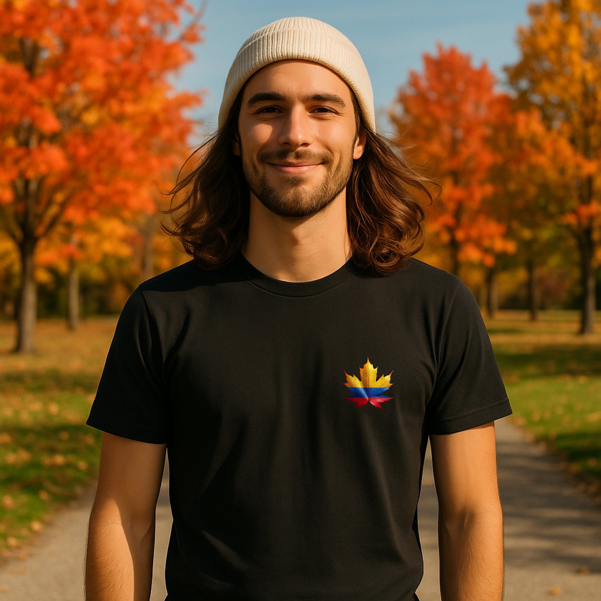 Show this exclusive design, which blends the Canadian maple leaf with the vibrant Colombian flag's colours on the front. The back says it all: "Colombian blood, Canadian heart."