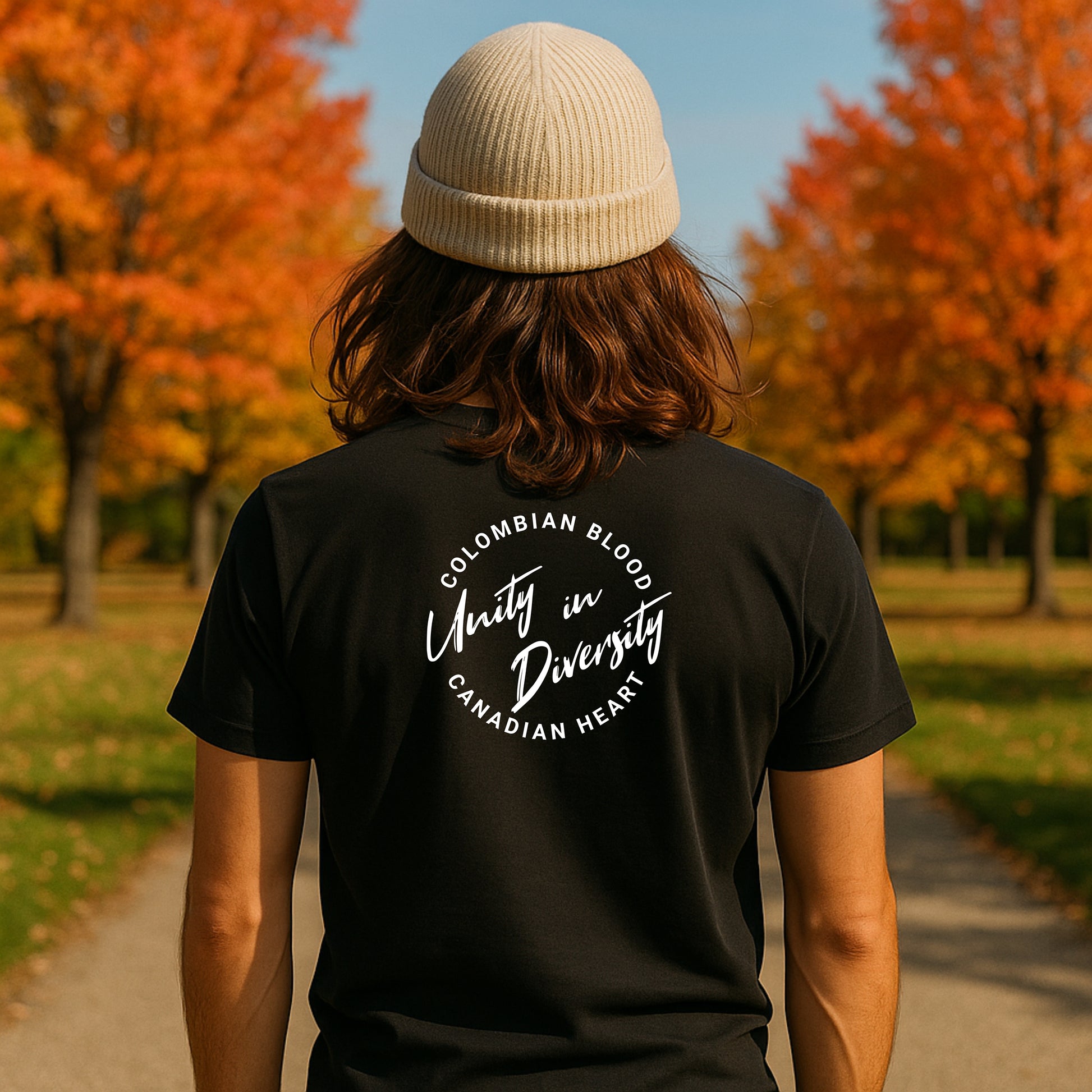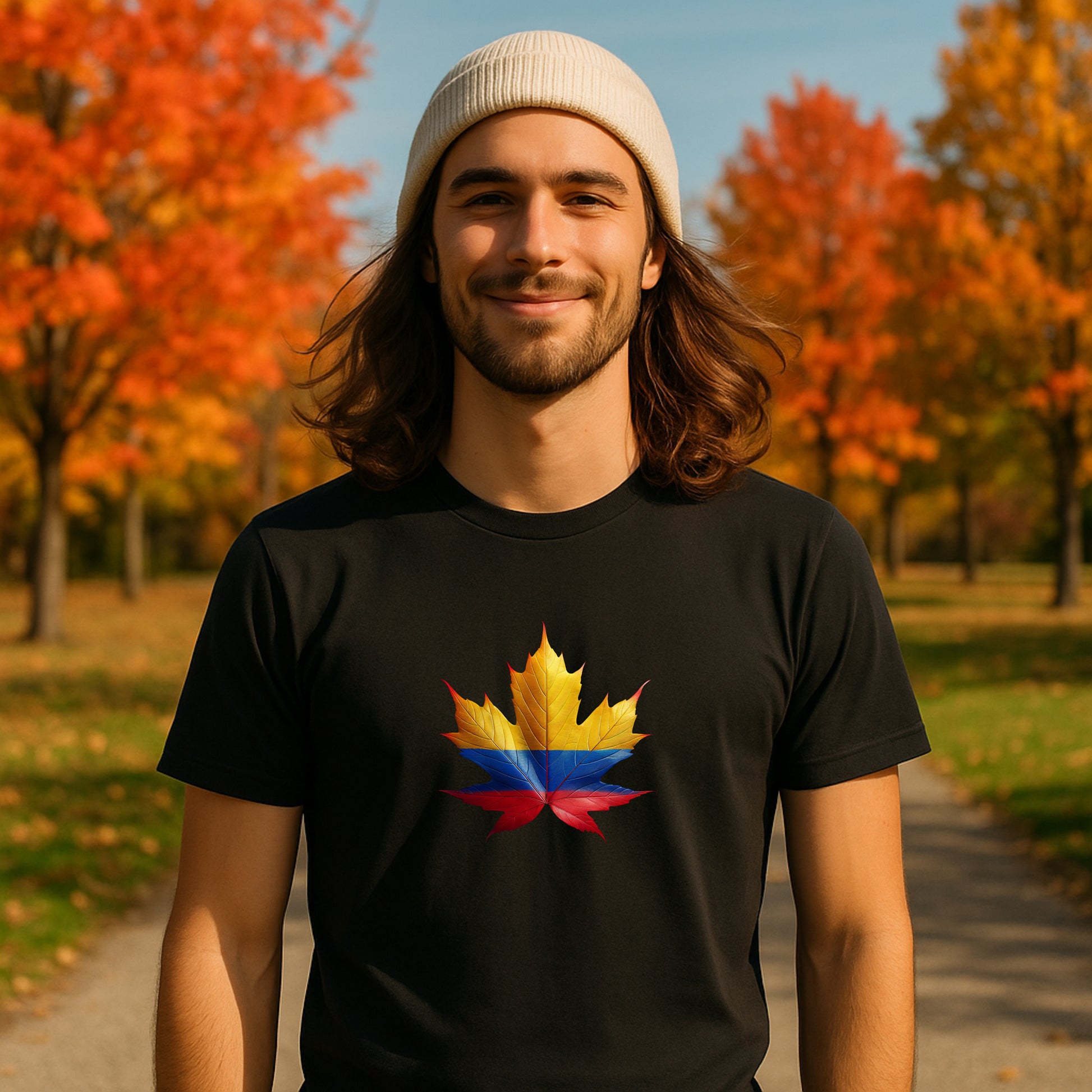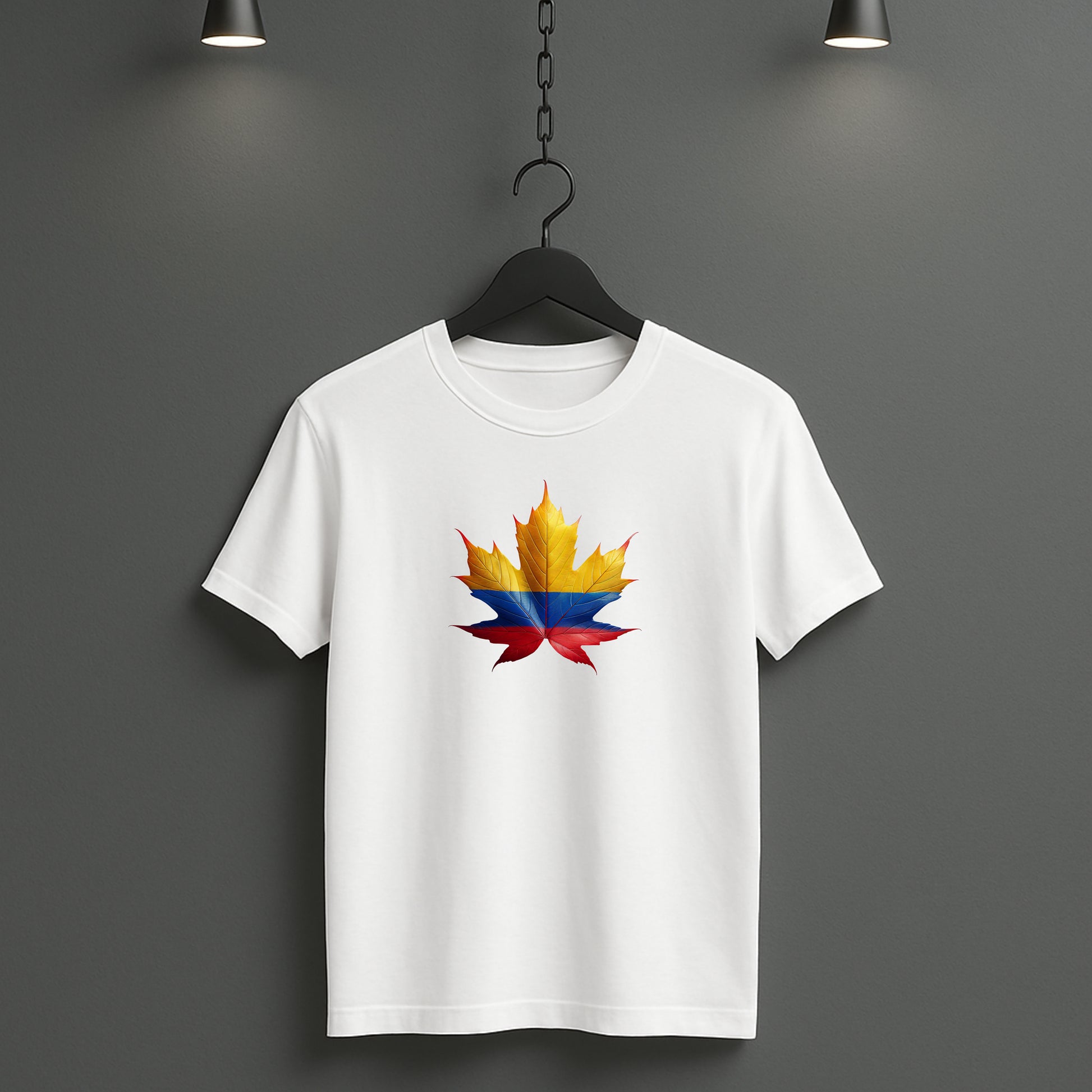 Show this exclusive design, which blends the Canadian maple leaf with the vibrant Colombian flag's colours on the front. The back says it all: "Colombian blood, Canadian heart."